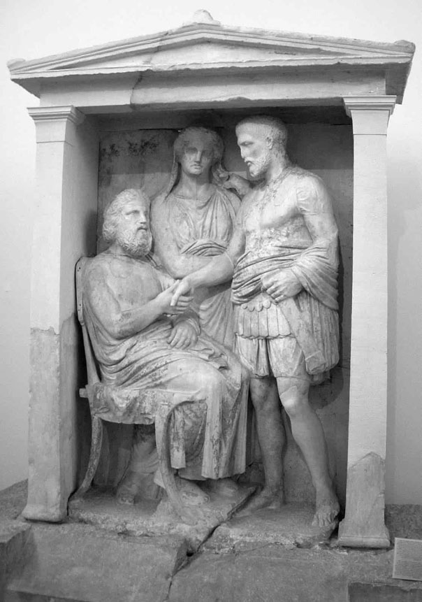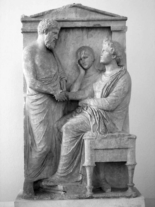 Αριστερά, ο Ιππόμαχος, όρθιος, του δίνει το δεξί του χέρι.