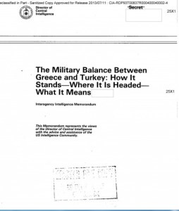Η CIA προέβλεπε πόλεμο ανάμεσα στις δυο χώρες με σοβαρές απώλειες και για τις δυο χώρες. Από τις ισορροπίες αυτές, δεν λείπει ούτε η Κύπρος, για την οποία γίνεται εκτενής αναφορά, ειδικότερα στα γεγονότα του 1974 και την εμπλοκή της Ελλάδος και πιο συγκεκριμένα στα γεγονότα του μαύρου Ιούλη του 1974, με την κάθοδο της Χούντας των Αθηνών στο νησί, όπου πραγματοποίησε το προδοτικό πραξικόπημα.