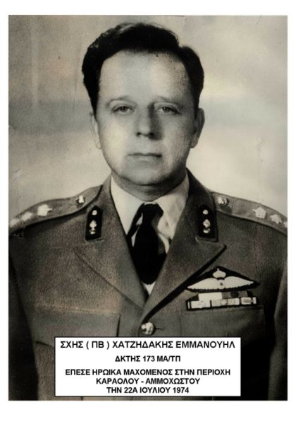 Την 8η Σεπτεμβρίου 1973 μετατέθηκε στην Κύπρο και ανέλαβε τη διοίκηση της 173 Μοίρας Αντιαρματικού Πυροβολικού (173ΜΑ/ΤΠ) με έδρα το στρατόπεδο «Ανδρέα Δημητρίου»στον Καράολο Αμμοχώστου. Η μοίρα κατά την Α’ Φάση της εισβολής υποστήριξε με πυρά τις Μονάδες που ενεργούσαν κατά των Τουρκικών θυλάκων της περιοχής Αμμοχώστου, ενώ ταυτόχρονα δεχόταν τον ανελέητο βομβαρδισμό της τουρκικής αεροπορίας. Στις 22 Ιουλίου περί την 15:30 ώρα τα τουρκικά αεροπλάνα βομβάρδισαν εκ νέου τις θέσεις της μοίρας, με αποτέλεσμα να φονευθούν ο Διοικητής Αν/χης Εμμανουήλ Χατζηδάκης, ο Ανθ/στης Ευάγγελος Κατσάνος, και ο δόκιμος έφεδρος αξιωματικός Σώτος Χατζηπροκοπίου. Οι τρεις θανόντες αξιωματικοί τάφηκαν στις 29 Ιουλίου στο νεκροταφείο Σταυρός Αμμοχώστου.