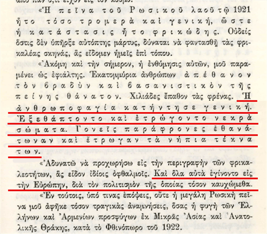 Ο Νορβηγός καθηγητής και διπλωμάτης Φρ. Νάνσεν, ο οποίος είχε ορισθεί από την Κοινωνία Των Εθνών (τώρα ΟΗΕ) ως Ύπατος Αρμοστής για τον επαναπατρισμό των απανταχού αιχμαλώτων έγραψε τo 1928 ότι η πείνα του Ρωσσικού λαού το 1921 ήταν φρικιαστική, πολλοί πέθαιναν από την πείνα, υπήρχε ανθρωποφαγία, έκαναν εκταφή πτωμάτων για να φάνε και το τραγικότατο, γονείς σκότωναν και έτρωγαν τα νήπια παιδιά τους.