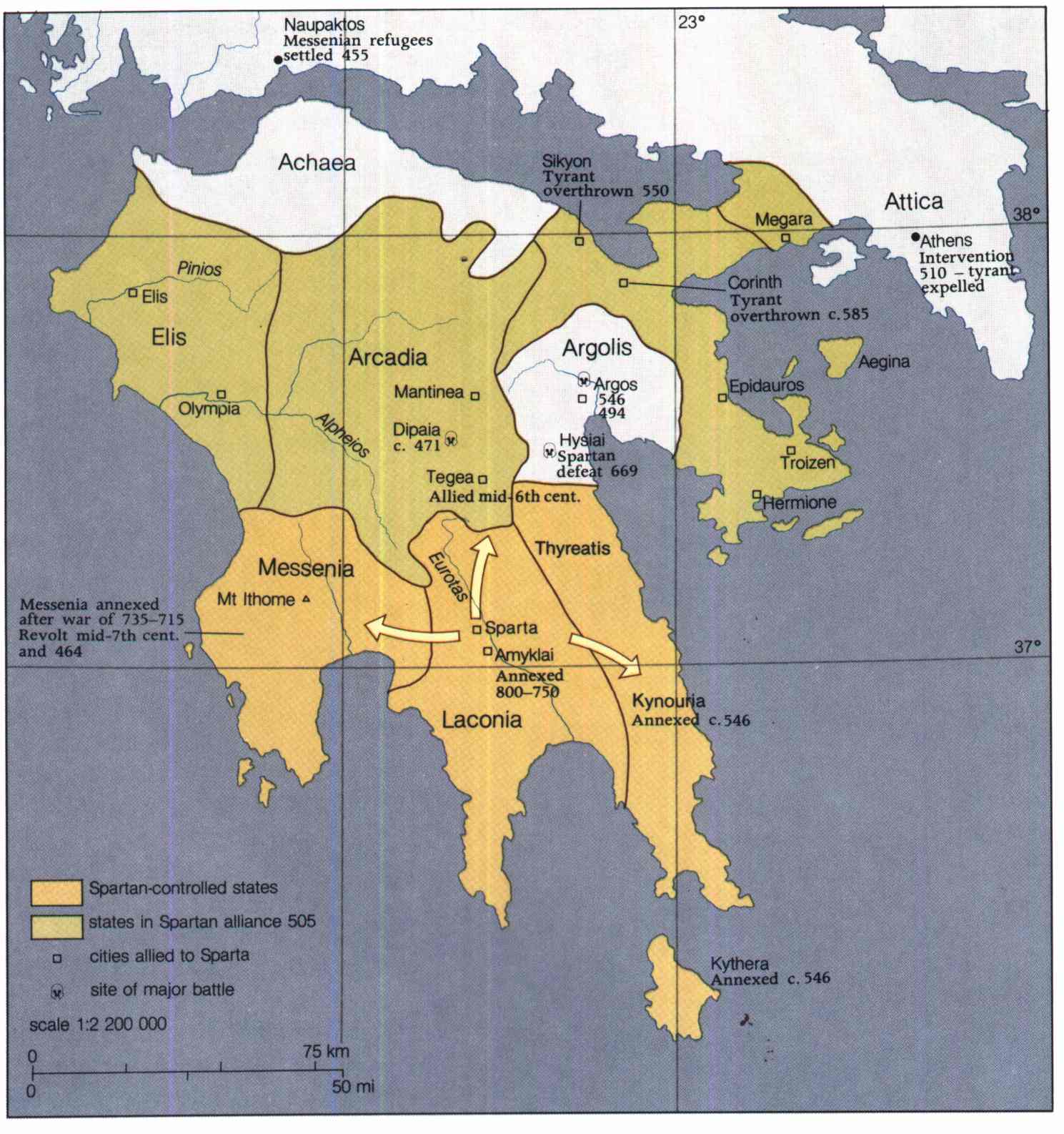 προσαρτήσει ορισμένα μεσσηνιακά εδάφη και θα δώσει έτσι κάποια διέξοδο στον πλεονάζοντα πληθυσμό της. Οι νικημένοι Μεσσήνιοι θα υποβιβασθούν σε Είλωτες και πολλοί θα προτιμήσουν να μεταναστεύσουν στην Ιταλία όπου θα λάβουν μέρος στον αποικισμό του Ρηγίου και του Μεταποντίου. Η Σπάρτη όμως είχε ήδη καταλάβει την κάτω κοιλάδα του Ευρώτα και μέχρι το 750 π.Χ. περίπου, είχε αποκτήσει τον έλεγχο ολόκληρης της περιοχής μεταξύ του Πάρνωνα και του Ταϋγέτου. Θα πρέπει να υπενθυμίσουμε στο σημείο αυτό, ότι το ισχυρότερο Δωρικό κράτος εκείνης της εποχής ήταν το Άργος, το οποίο κατείχε την Θυρεάτιδα (σημερινή περιοχή του Άστρους της Κυνουρίας), την Κυνουρία και την χερσόνησο μέχρι το ακρωτήριο Μαλέας, καθώς και τα Κύθηρα.