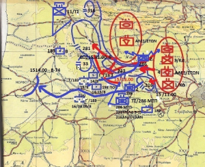 Με την άφιξη της φάλαγγας στη νέα θέση, εμφανίστηκε από την αντίθετη κατεύθυνση ένα πολιτικό όχημα στο οποίο επέβαινε ο διευθυντής του 3ου Ε.Γ της ΔΠΒ του ΓΕΕΦ, ταγματάρχης Εμμανουηλίδης Ευστράτιος. Με αίσθημα ανακούφισης, μου είπε ότι, επιδίωκε να με συναντήσει όλο το απόγευμα, αλλά δεν μπορούσε να προσεγγίσει το χώρο αναπτύξεως. Με ρώτησε τι σκόπευα να κάνω σ’ εκείνο το χώρο και του απάντησα για την πρόθεσή μου να ταχθώ στη θέση αυτή, την οποία είχε εγκρίνει και η Μοίρα, για να συνεχίσω τα πυρά υποστήριξης στα τμήματα επιβραδύνσεως από τις πρώτες πρωινές ώρες. Ο διοικητής μου βέβαια, ο οποίος δεν εμφανίστηκε όλο αυτό το διάστημα στην πυροβολαρχία, φαίνονταν να μην έχει καμιά επαφή και με τη ΔΠΒ/ΓΕΕΦ. Γι’ αυτό και δεν ήταν ενημερωμένος για την εξέλιξη της κατάστασης. Αυτοσχεδίαζε χωρίς συντονισμό και επαφή με τα προϊστάμενα κλιμάκια.
