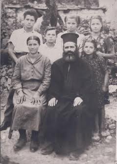 Η οικογένεια του παπα-Ηλία Λακαφώση το 1949. Ανάμεσα στα πρόσωπα των γονέων του, ο Κώστας Λακαφώσης που έζησε τα γεγονότα της 22ας Ιουνίου 1943 στο Λευκαδίτι, ως μικρό παιδί.[Αρχείο Κων/νου Λακαφώση] |