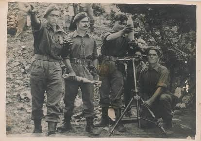 | Στοιχείο Όλμου της Β’ Μοίρας Καταδρομών σε διάλειμμα των επιχειρήσεων. Βουλγαρέλι 20/8/1948. Αριστερά με τα κυάλια, ο Λοχίας Δημ. Κούτρας. [Αρχείο Οικογενείας Κούτρα]. |