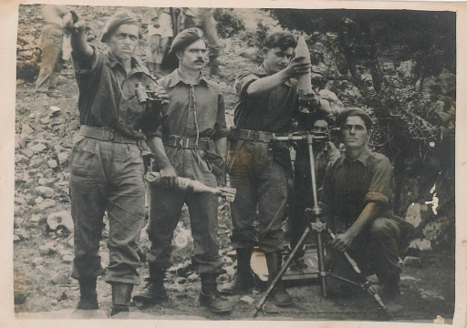 φωτό 3. Στοιχείο Όλμου της Β’ Μοίρας Καταδρομών σε διάλειμμα των επιχειρήσεων. Βουλγαρέλι 20/8/1948. Αριστερά με τα κυάλια, ο Λοχίας Δημ. Κούτρας (Αρχείο Οικ. Δ Κούτρα)