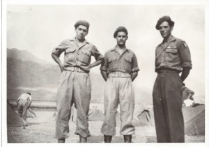 φωτό 8. Στο στρατόπεδο της Β’ ΜΚ, κάπου στην Ελλάδα. Αριστερά ο Δημ. Κούτρας, δεξιά ο καταδρομέας Αθαν. Βαρβάτος από την Βουνιχώρα της Φωκίδας. Στη μέση άγνωστος καταδρομέας της Μοίρας. (Αρχείο Οικ. Δ. Κούτρα)