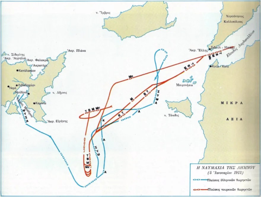 [23] «Αρχηγός Βουλγαρικού Επιτελείου ανεκοίνωσεν Φραντζή τηλεγράφημα εκ Δεδεαγάτς, κατά το οποίον Τουρκικός Στόλος ετοιμάζεται να εξέλθη. Αναχωρεί πιθανόν αύριον ή μεθαύριον. Περιελθούσαι ημίν οδηγίαι Τουρκικού ναυαρχείου περιλαμβάνουσι διαταγήν όπως εχθρικός στόλος προσελκύση Ελληνικόν υπό φρούρια και συγκεντρώση πυρ διαδοχικώς επί εκάστης μονάδος ημετέρου στόλου. Εν προβλέψει τούτων συνιστώ ανάκλησιν αντιτορπιλλικών, φρουρούντων διόδους Χίου. Υπουργός Στράτος.» Φωκάς Δ., Ο Στόλος του Αιγαίου… σελ.186.