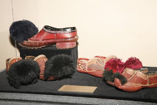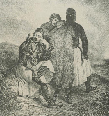 Τα πόδια τους τα σκέπαζαν ως πάνω στα σκέλια με τις μακριές άσπρες κάλτσες, που τις λέγανε βλαχόκαλτσες. Τις ύφαιναν από τραγόμαλλο και είχανε ειδικότητα στην κατασκευή τους στα Άγραφα. Οι τσόχινες μαύρες κάλτσες, κι’ ύστερα κόκκινες – μοιάζανε με τις γκέτες – σκέπαζαν μονάχα τη γάμπα και το πάνω μέρος του παπουτσιού και φορέθηκαν στα οθωνικά χρόνια. Στο Εικοσιένα αυτές οι κάλτσες ήταν άγνωστες. Η ποδεμή τους ήταν τα τσαρούχια, όχι όμως με φούντα μπροστά αλλά μυτερά. Τα έφτιαχναν με ακατέργαστο βοδινό δέρμα και ήταν πολύ ελαφρά και γερά. Στα πόδια τους τα στήριζαν δένοντάς τα γύρω στη γάμπα τους με φαρδύ λουρί – τις θηλιές – και το λουρί αυτό το έπιαναν απ’ την κάλτσα τους κάτω απ’ το γόνατο με το τσαρουχοτοκά. Υπήρχε και άλλος τρόπος να πιάνουν τα τσαρούχια τους με ένα πισινό λουρί, το τσαγκαρόλουρο. Τα πρώτα τα φορούσαν στη Ρούμελη, ενώ τ’ άλλα στο Μοριά. Οι φτωχότεροι φορούσαν γουρνοτσάρουχα, φτιαγμένα από δέρμα χοίρου.