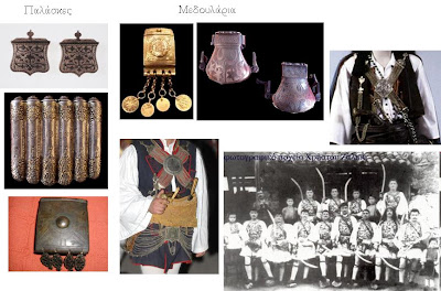 Την όλη τους φορεσιά συμπλήρωναν και τα στολίδια τους, τα τσαπράζια ή τουσλούκια, όπως τα έλεγαν. Πρώτο ήταν το κουτσέκι. Στόλισμα ασημωμένο που στις τέσσερες πλευρές του κρεμόνταν σειρά από ψιλές αλυσίδες και κάλυπτε ολόκληρο το στήθος. Στηρίζονταν με θηλιές στις τέσσερες άκρες του στήθους, με τρίγωνα θηλικωτήρια που είχαν ζωγραφισμένο πάνω τους με σαββάτι (μαύρο σμάλτο) συνήθως το δικέφαλο αητό και στη μέση το κουτσέκι σε μεγάλη πλάκα είχε τους πολεμικούς αγίους, τον Αη-Γιώργη και τον Αη-Δημήτρη. Επειδή τα πιο πολλά τσαπράζια ήταν ζωγραφισμένα με σαββάτι, τα λέγανε σαββατλίδικα. Απ’ το αριστερό τους ώμο ήταν κρεμασμένο μ’ ασημένια αλυσίδα το στρογγυλό χαϊμαλί που έκλεινε μέσα του διάφορα φυλαχτά. Στις δυο όψεις του είχε σκαλισμένα τον προστάτη άγιο του και το Βαγγελισμό ή την Ανάσταση. Στην δεξιά μεριά είχαν μεριά είχαν το γυριστό ασημένιο σουγιά τους. Στο πίσω μέρος, στη μέση τους, στο λουρί του σελλαχιού, ήταν περασμένες οι δυό μπαλάσκες που πάνω τους είχαν πελεκημένη ανάγλυφα σχέδια π.χ. την Παρθένα Αθηνά. Μέσα βάζανε τα φουσέκια για τα ντουφέκια τους. Αριστερά πάλι απ’ τη λουρίδα του σελλαχιού κρεμόντανε τα φυσεκλίκια, με φουσέκια για τις κουμπούρες και μια θήκη που βάζανε τις τσακμακόπετρες, το μεδουλάρι, άλοιμα για τα ντουφέκια φτιαγμένο από μεδούλι και άλλες λιπαρές ύλες. Δεξιά μεριά κρεμόνταν κι η πέτσινη καπνοσακκούλα τους. Όλα τούτα τα δένανε μ’ ασημένια και πλουμιστά ζωστάρια. Μπροστά στον αριστερό μηρό, σε μακριά λουριά περασμένα – σε δυο σε τρεις αράδες – κρεμόνταν τα στρογγυλά ή και τρίγωνα ασημένια γαντζούδια ή τοκάδες. Δυο όμοια γαντζούδια σκέπαζαν τα γόνατά τους. Τούτο το στόλισμα το συνήθιζαν πολύ πριν το 1800. Και βλέπουμε να φοράει κάτι τεράστια ο πατέρας του Οδυσσέα, ο γερο Αντρούτσος όπως μας τον παρουσιάζει παλιά ζωγραφιά.