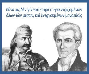 Εν όσω ο εχθρός είναι εις την Ευρώπην, πρέπει να προφυλαττώμεθα, και διά να προφυλαχθώμεν, πρέπει να είμεθα δυνατοί. Αλλά δύναμις δεν γίνεται παρά συγκεντριζομένων όλων των μέσων, και ενεργουμένων μονοειδώς. Το επαναλαμβάνω· αυτή η διεύθυνσις [των στρατιωτικών επιχειρήσεων υπό ‘μονοειδή’ ηγεσία] δεν ημπορεί να έχη άλλον σκοπόν, παρά την φύλαξιν του αποκτηθέντος καλού. Στοχάζομαι λοιπόν, ότι η κατασκευή των δημοσίων δυνάμεων εις τους ελευθερωθέντας τόπους πρέπει να είναι απλουστάτη και όσον το δυνατόν παρομοία με την παλαιάν των κατασκευήν. Οι νεωτερισμοί θέλουν κάμει περισσότερον κακόν παρά καλόν. Ο τόπος πρέπει να έχη μίαν διοίκησιν, τί μέλει αν αυτή η διοίκησις έχη τοιούτον ή άλλον σχήμα; Απαιτείται να είναι καλή και ισχυρά. Εις όλους τους καιρούς η της Ελλάδος διοίκησις ήτον πραγματικώς επιτροπική (représentative)· (ξ)