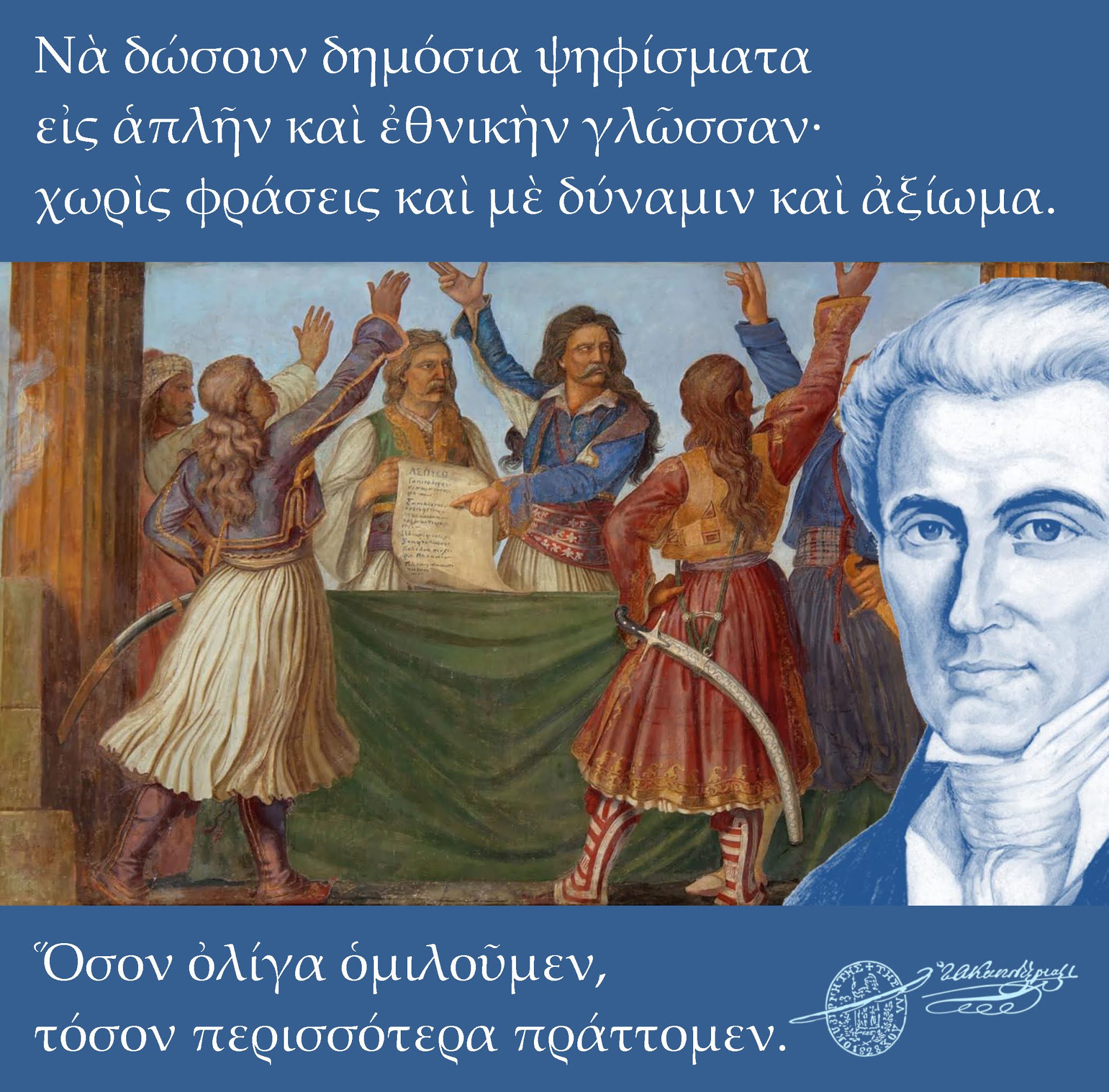 Δον. Άν αι περιστάσεις απαιτούν, ώστε και αι νέαι διοικήσεις των ελευθερωθέντων τόπων να δώσουν δημόσια ψηφίσματα, άξια να παρρησιασθούν εις την Ευρώπην, επιθυμητόν ήττον να παρρησιάσουν εις απλήν και εθνικήν γλώσσαν· πρέπει να λέγουν τα πράγματα χωρίς φράσεις και με δύναμιν και αξίωμα· Όσον ολίγα ομιλούμεν, τόσον περισσότερα πράττομεν· αλλά αν γράφωμεν πολλά και πολλά αν διακροτώμεν, αναγγέλομεν ότι δεν ηξεύρομεν και ότι δεν ημπορούμεν τίποτε να πράξωμεν.