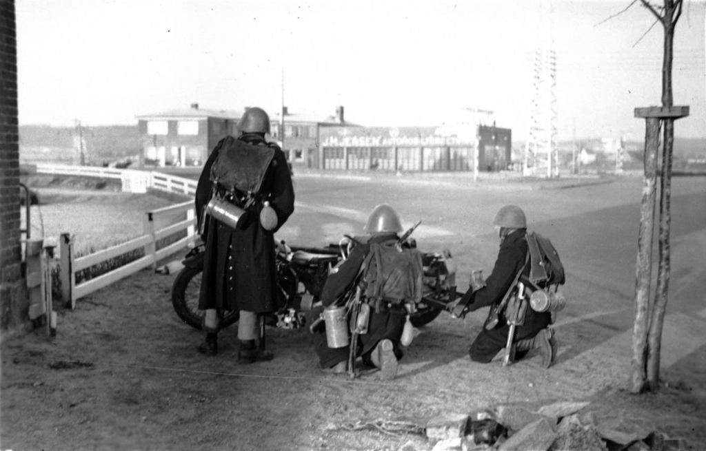 Δανοί στρατιώτες που μόλις έχουν καταθέσει τα όπλα δίπλα στο πτώμα νεκρού συναδέλφου τους στο Χάντερσλεβ. Διακρίνεται ελαφρύ αντιαρματικό πυροβόλο Solothurn S18-1000 των 20 χλστ.