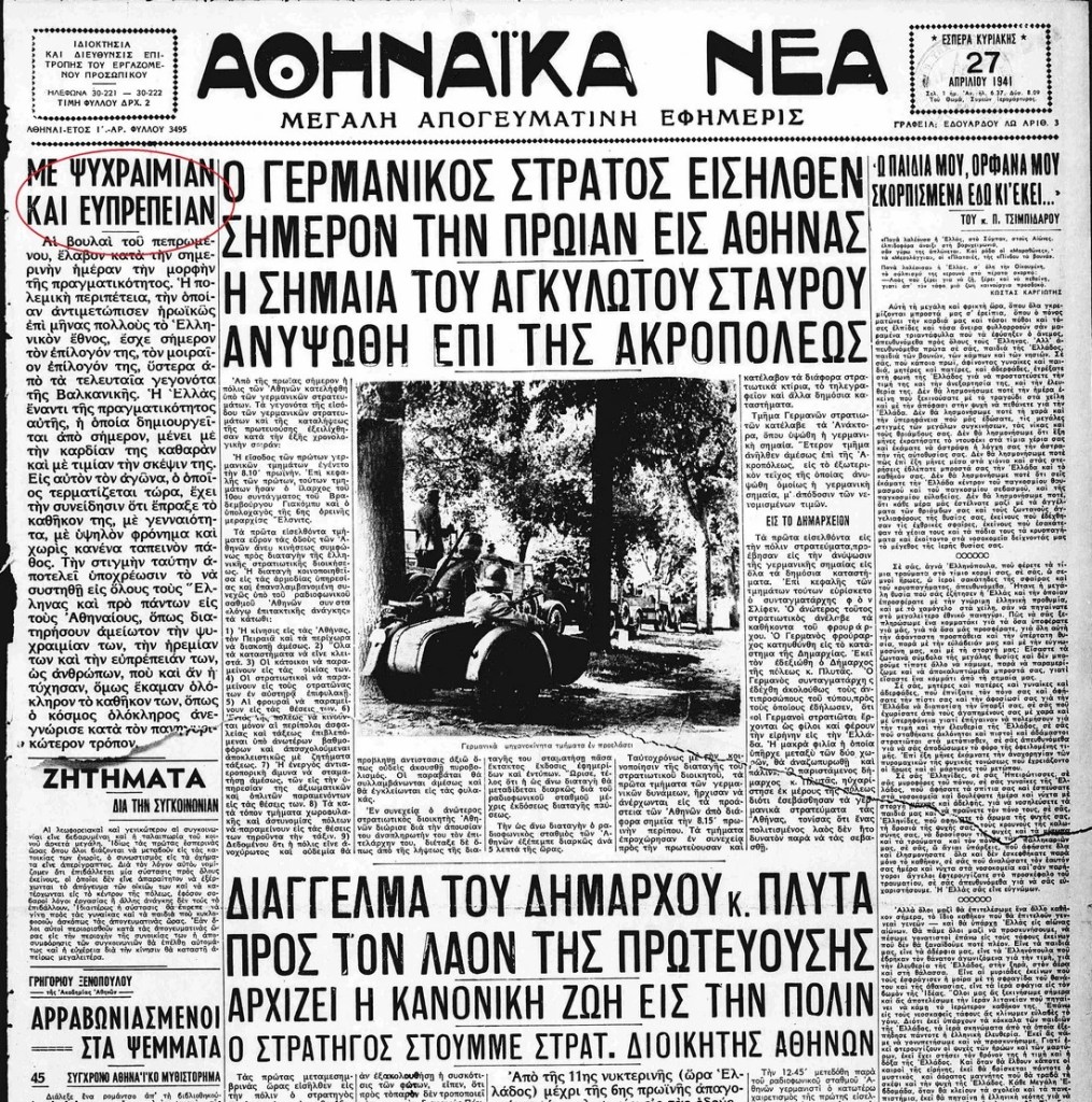 Η πλειοψηφία των Αθηναίων αντιλήφθηκε την παράδοση της πόλης όταν στις εννέα παρά τέταρτο το πρωί υψώθηκε στην Ακρόπολη η σημαία με τον αγκυλωτό σταυρό.