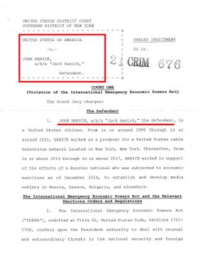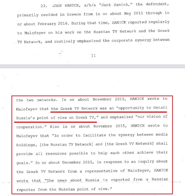 Στα αμερικανικά κατηγορητήρια κατά των δύο ανδρών (https://ia802506.us.archive.org/33/items/gov.uscourts.nysd.577882/gov.uscourts.nysd.577882.6.0.pdf… και https://justice.gov/usao-sdny/press-release/file/1479811/download…) τεκμηριώνεται ότι ο Hanick εργαζόταν για τον Malofeyev και ότι συνεργάζονταν για τη δημιουργία τηλεοπτικού δικτύου στην Ελλάδα με στόχο»να αναδείξει τη ρωσική οπτική γωνία».