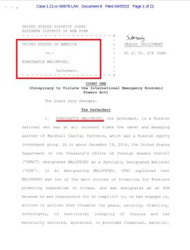Λόγω των κυρώσεων που επιβλήθηκαν στον Malofeyev το 2014 από τις ΗΠΑ (νόμος IEEPA) απαγορευόταν η επιχειρηματική συνεργασία του με αμερικανούς πολίτες. Όμως στις 3.2.2022 συνελήφθη ο τηλεοπτικός παραγωγός John (Jack) Hanick με την κατηγορία ότι συνεργαζόταν με τον Malofeyev.