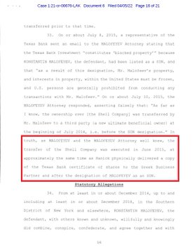 Μεταξύ άλλων περιγράφεται η μεταβίβαση από τον Malofeyev με μεσολάβηση του Hanick σε κάποιον «Greek Business Partner» το 2015, μιας offshore εταιρίας-κελύφους με κυριότητα μετοχών αξίας 10 εκ. $ στο Τέξας, έναντι ενός δολλαρίου – κλασική περίπτωση κεκαλυμμένης χρηματοδότησης.