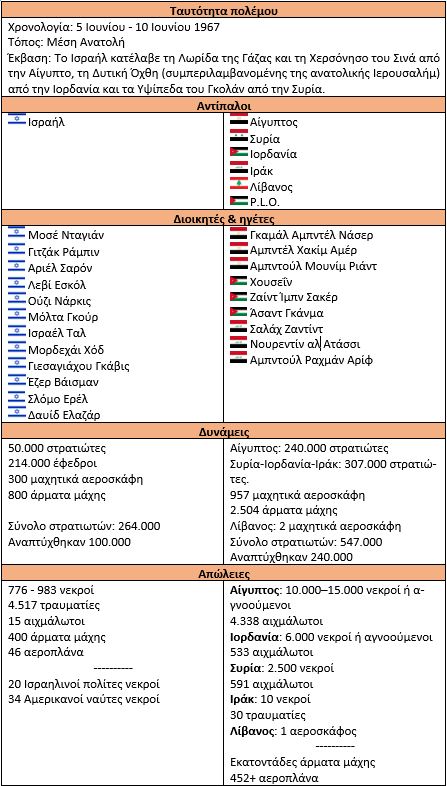 | Άρματα μάχης | Η Αίγυπτος, η Συρία και το Ιράκ χρησιμοποίησαν T-34/85, T-54, T-55, PT-76 και SU-100/152 Σοβιετικά αυτοκινούμενα άρματα του Β’ Παγκοσμίου Πολέμου. Η Ιορδανία χρησιμοποίησε άρματα US M47, M48 και M48A1 Patton. Panzer IV, Sturmgeschütz III και Jagdpanzer IV (πρώην Γερμανικά άρματα που χρησιμοποιήθηκαν από τη Συρία). | M50 και M51 Shermans, M48A3 Patton, Centurion, AMX-13, M32 όχημα περισυλλογής αρμάτων δεξαμενών. Το Centurion αναβαθμίστηκε με το Βρετανικό πυροβόλο των 105 mm L7 πριν τον πόλεμο. Το Sherman υπέστη επίσης εκτεταμένες τροποποιήσεις, όπως μεγαλύτερη ταχύτητα, Γαλλικό πυροβόλο, επανασχεδιασμένο πυργίσκο, ευρύτερες ερπύστριες, μεγαλύτερη θωράκιση, αναβαθμισμένη μηχανή και αναρτήσεις. |