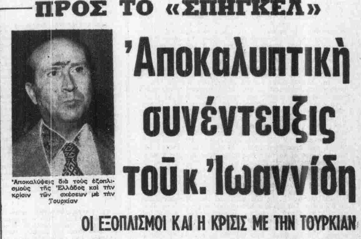 «Ενισχύσαμε τα στρατεύματά μας στη συνοριακή περιοχή του Έβρου και στα νησιά.Παράλληλα συνεχίστηκε η προμήθεια πολεμικού υλικού. Αρχικά, παραγγείλαμε νέα Φάντομ, A-7D μαχητικά-βομβαρδιστικά και μεταγωγικά C-130 από την Αμερική. Αγοράσαμε επίσης πυραυλικά σκάφη, αντιτορπιλικά, τανκς, ιχνηλατούμενα οχήματα, όπλα από Γαλλία, Δυτική Γερμανία, Ιταλία και Νορβηγία.Λόγω αυτών των αγορών, η Ελληνική Πολεμική Αεροπορία, για παράδειγμα, θα είναι μεταξύ των ισχυρότερων ενεργών αεροπορικών δυνάμεων στην Ευρώπη μέχρι το τέλος του 1975».